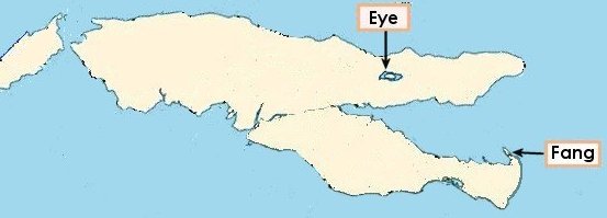 Malaysia and Thailand form the lower jaw, the island of Sumatra forms the upper jaw and head, and the other islands form the tail. Here's a close up of the head: